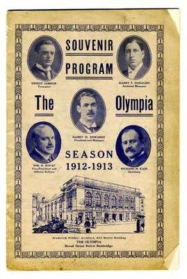 (Boxing Programs.) "Souvenir Program The Olympia Season 1912-1913." (Philadelphia), (July), (1912). * The Olympia Souvenir Program Season 1912-1913." (Philadelphia), (Oct.), (1912). Both 8vo, orig. wrappers; minor wear,upper fore-edge corner of front wrapper of the 1st program chipped away, wrapper slightly toned. Adverts. Inserted into the 1st program is a printed Grand Opening label. The 1st program lists among its "ring events" for July 10, 1912, the boxing match between Phila. Jack O'Brien and Young Jack O'Brien.