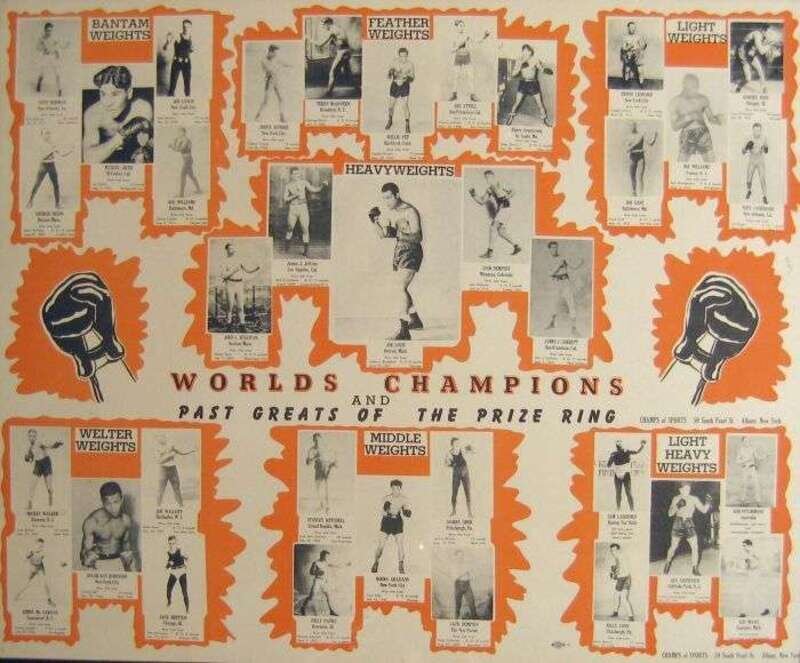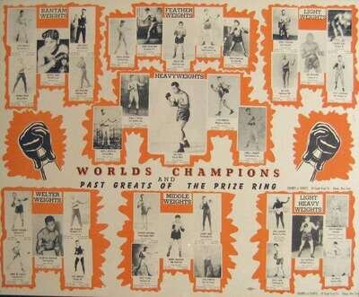Boxing Posters & Ephemera: Cigarette Boxing Cards. WA & AC Churchman, ca. 1930s. 25 mounted cards on orig. gold & black Churchman's Cigarette Cards mount. Approx. 22 x 10 1/2 inches (560 x 266 mm). Clean. Contemp. (orig.?) frame. * Poster. "World Champions and Past Greats of The Prize Ring." Albany, N.Y.: Champs of Sport, [ca. 1947]. 22 x 27 1/2 inches (558 x 700 mm). Printed in orange & black. Clean. Framed. * Poster. "An Account of The Grand Fight between Ward & Byrne, for The Belt,..., which took place... Stoney Stratford,... July 12th, 1831." Clarkenwell: J.V. Quick, (1831) [but Philadelphia, Print Club, ca. 1970]. 1/97 copies. 24 1/2 x 18 inches 9622 x 457 mm). Facs. of orig. 1831 broadside, printed in orange & black. Clean. Framed.