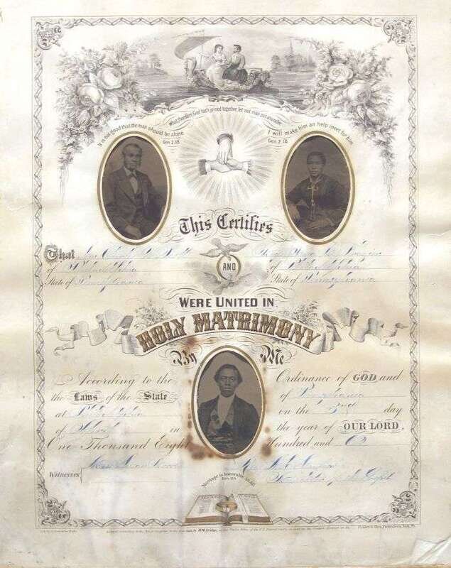 African-American 19th-Century Marriage Certificate with Photographs. Lithographic marriage certificate. York, Pa.: Crider & Bros., Publishers, 1868. Folio (approx. 18 x 13 3/4 inches), vignette borders, filled-in in ms., with 3 tintype photo portraits in oval apertures (approx. 3 1/4 x 2 inches each); a few chips & some staining in margins. In old frame.