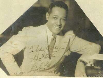 Photograph Signed. Ellington, Duke. Ca. 1930. Silver print, approx. 6 1/2 x 8 1/2 inches (165 x 216 mm), trimmed to trapezoid-like shape - upper corners cut away. Inscription & signature a little faded.