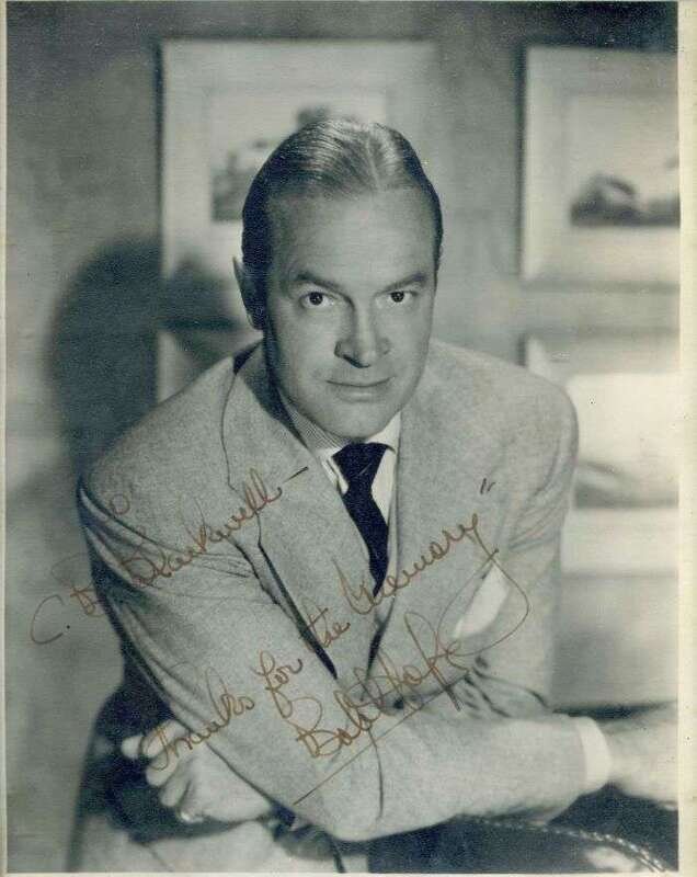 Photograph Signed & Inscribed. Hope, Bob. Silver print portrait, 10 x 8 inches (252 x 203 mm). Ca. 1950s. Clean. Bold, clear autograph. Framed. "To / C.B. Blackwell - / Thanks for The Memory / Bob Hope."