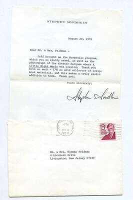 Typed Letter Signed. Sondheim, Stephen. (New York), Aug. 28, 1978. 1 p., 8vo; horizontal crease along fold. To Mr. & Mrs. Norman Feldman, thanking them for the gift of the Norwegian program for A Little Night Music & a photograph of the theatre where it was performed. On Sondheim's letterhead. With typed addressed envelope. Sondheim's signature bold & dark.
