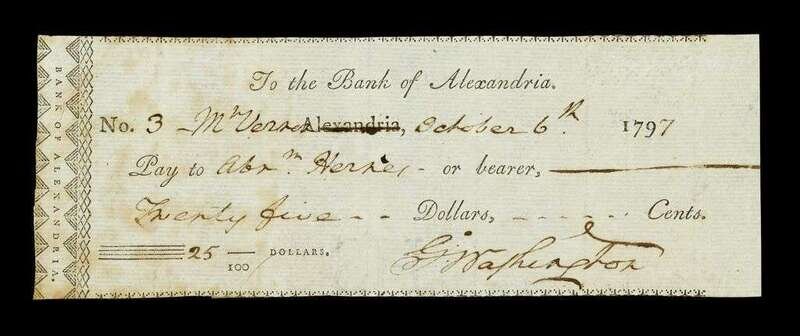 Bank Check Signed. Washington, G(eorge). To the Bank of Alexandria [Virginia], October 6, 1797. 2 3/8 x 6 9/16 inches (60 x 166 mm). Occasional very minor foxing, 3 light vertical creases (1 running through the cross of the letter "T" & the center of the letter "N" of Washington's signature), very small perforation (approx. 3x 3 mm) in center of check - not affecting printing or manuscript. Printed & type-ornamented document filled-in in ms. Washington signature clear & generally dark. Attractive signed check.