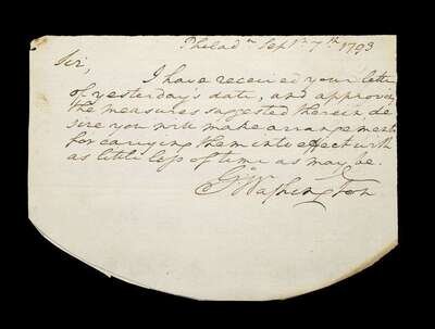 Autograph Letter Signed. Washington, G(eorge). Philadelphia, Sept. 7th, 1793. (To Thomas Jefferson) "Sir, / I have received your letter /of yesterday's date, and approving /the measures suggested therein, de / sire you will make arrangements / for carrying them into effect with / as little loss of time as may be / G: Washington." Docketed, "To / The Secy of State / of Sept. 1794." Clean, clear & dark, trimmed to fit oval frame (removed from frame) - with no loss of lettering, 5 1/2 x 7 1/2 inches (140 x 190 mm).