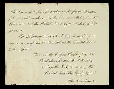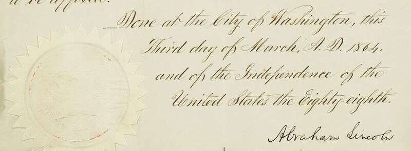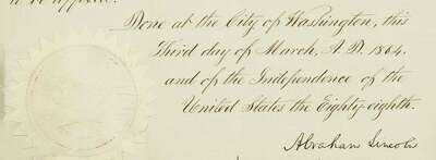 Manuscript Document Signed. Lincoln, Abraham. Washington, March 3, 1864. 2 pp., folio (16 1/4 x 10 3/8 inches; 412 x 263 mm); separated along horizontal fold - no loss of text, several generally light vertical creases; one light vertical crease through the letter "a" of Abraham Lincoln's signature. With paper seal. Clean with bold, dark Lincoln signature, also signed by Secretary of State William Henry Seward. Ms. document on both sides of folio leaf, with integral blank leaf, separated & also split along horizontal fold.
