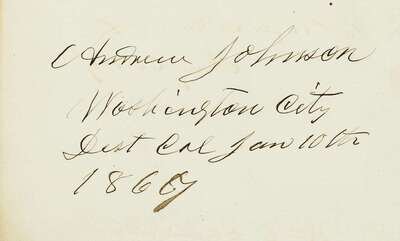 Along with manuscript sentiments & signatures from the original owner's (Miss Boner?) friends & family the album contains the autograph signatures of A(braham) Lincoln, & several members of his cabinet: his private secretary, John Hay, Postmaster W(illiam) Dennison, also dated in his hand, "29 Oct. 1864," Sec. of The Navy Gideon Welles, also dated in his hand, "29th Oct. 1864," Sec. of Interior J(ohn) P(almer) Usher, also dated in his hand, "29th Oct. 1864," Sec. of State William H(enry) Seward, The album also includes the autograph signatures of Andrew Johnson, also dated in Johnson's hand, "Washington City / Jan. 10th / 1867," and several members of his cabinet: Sec. of Interior O(rville) H. Browning, so designated in his own hand - "Secretary of The Interior, Jan. 31, 1867," Sec. of Treasury Hugh McColloch, also dated in his hand, "May 30, 1867," Assistant Sec. of Treasury W.E. Chandler, also dated in his hand, "January 1867." Also includes signatures of several lower level Lincoln appointees. Signatures of Lincoln & Johnson each as President.