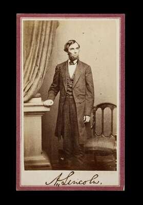Original Photograph Signed. Lincoln, A(braham). Carte-de-Visite standing portrait of Abraham Lincoln, signed below image. 4 x 2 1/2 inches (102 x 62 mm), purple borders; very minor edge wear. Clean & attractive.