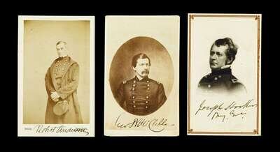 Holding 60 Carte-de-Visite portraits of Union political & military notables. Signed photos include Robert Anderson (comdr. of Ft. Sumter), Gen. Joseph Hooker, Gen. George B. McClellan, Gen. Fitz-John Porter, Gen. Winfield Scott (signed on verso) - not shown in uniform, Montgomery Blair (Lincoln's Postmaster General, counsel for Dred Scott), William H. Seward (Lincoln's Sec. of State), Gideon Welles (Lincoln's Sec. of Navy); also signed photos of Robert & Louis Philippe D'Orleans (French-born nobles serving under McClellan).