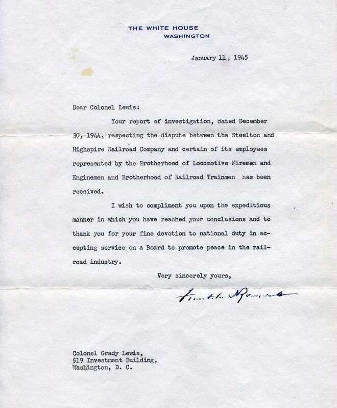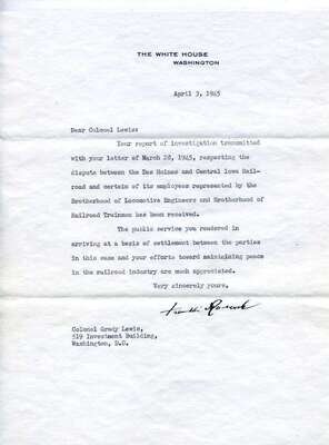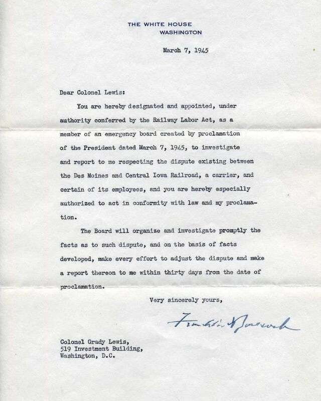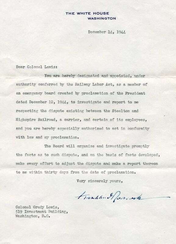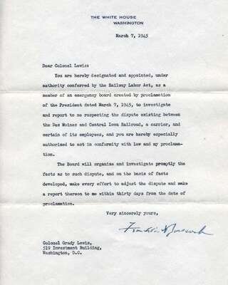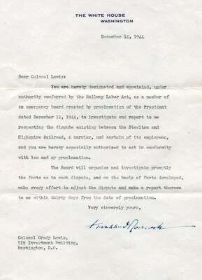 Typed Letters Signed. Roosevelt, Franklin D. All 1 p., 4to, on White House letterhead, all to Colonel Grandy Lewis: Washington, December 14, 1944. Appointing Colonel Lewis as member of emergency board under the Railway Labor Act, investigating dispute between the Steelton and Highspire Railroad and certain of its employees. * Washington, January 11, 1945, thanking Colonel Lewis for his service re the dispute between the Steelton and Highspire Railroad Company & Brotherhood of Locomotive Firemen [etc.]. * Washington, March 7, 1945. Appointing Colonel Lewis as member of emergency board under the Railway Labor Act, investigating dispute between The Des Moines and Central Iowa Railroad and employees. * Washington, April 3, 1945, expressing his appreciation for Colonel Lewis's report on the above dispute.