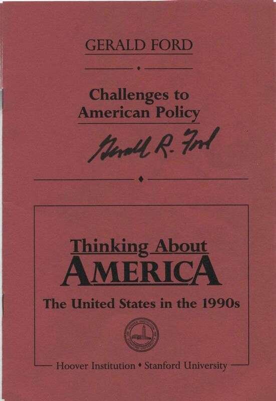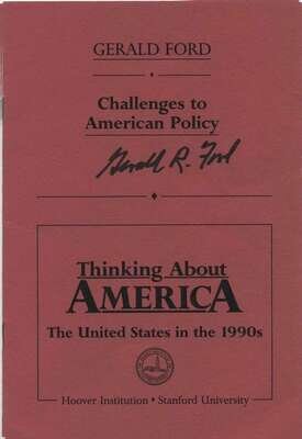 Ford, Gerald R. (Thinking About America, The United States in The 1990s.) "Challenges to American Policy." Stanford Univ.: Hoover Institution, (1988). 8vo, orig. red wrappers. Signed by Gerald R. Ford on front wrapper. Near Fine.