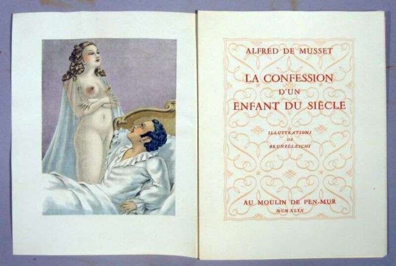 (Brunelleschi, illustrator.) Musset, Alfred. [Oeuvre.] Au Moulin de Pen-Mur, 1948-1949. 12mo, orig. wrappers, chemises with paper spine labels, slipcases. Erotic color pochoir illustrations by Brunelleschi. Loose as issued. Internally clean. Minor wear.