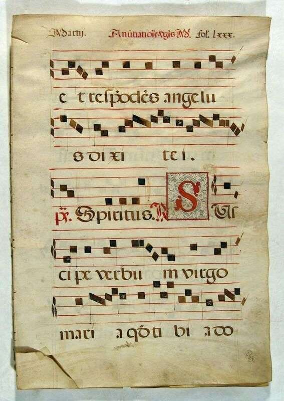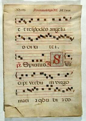 Manuscript Choir Book Leaves. European Continent, ca. 15th-16th Centuries. Folio. Includes 1 double leaf, decorated initials. 1 single leaf worn & chipped.