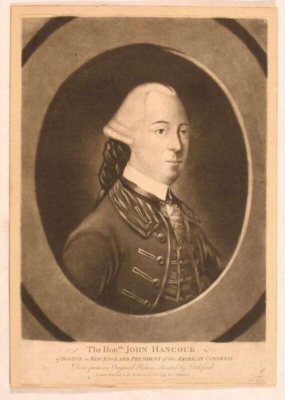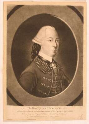 Mezzotint Engraving. "The Honorable John Hancock of Boston in New England; President of The American Congress." London, Oct. 25, 1775. 14 x 9 7/8 inches (355 x 250 mm), margins. Clean but trimmed within platemark.