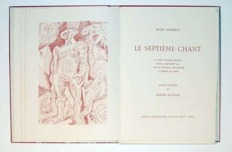 (Masson, Andre, illustrator.) Jouffroy, Alain. Le Septieme Chant. Paris: Societe Internationale d'Art XXe, (1974). #158/210 signed by Jouffroy & Masson. Folio, orig. wrappers, orig. red cloth slipcase & chemise. With 4 engraved plates by Masson. Loose as issued. Some dampstaining to slipcase, otherwise clean & bright.