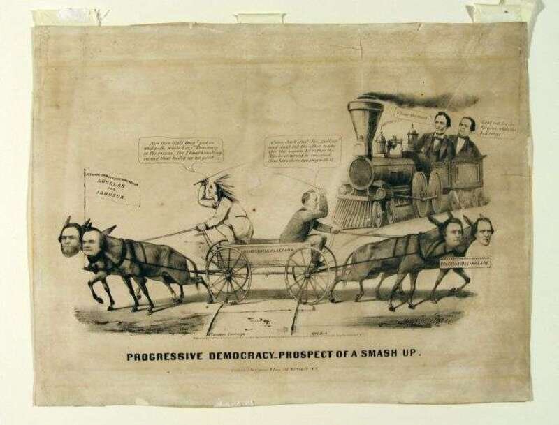 Lithograph. Currier, N.; Ives, J.M., publishers. "Progressive Democracy - Prospect of a Smash Up." New York, 1860. 13 7/8 x 17 3/4 inches (352 x 450 mm) - sheet size. Slightly dusty at edges, mounted along verso edges. Framed.