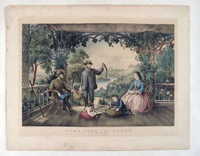 Hand-Colored Lithograph. (Currier, N.; Ives, J., publishers.) "Home from The Brook. The Lucky Fisherman." New York, 1867. 18 1/4 x 24 5/8 inches (463 x 625 mm) - image & text; 23 7/8 x 301/8 inches (606 x 765 mm) - sheet size. Light to moderate foxing outside image, some light to occasionally moderate foxing to image.
