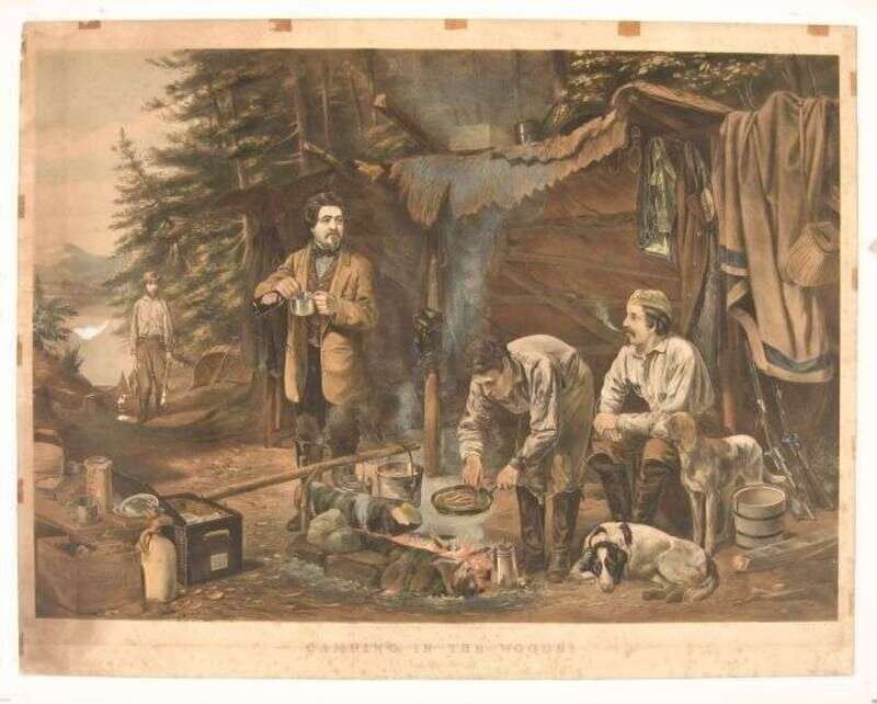 Hand-Colored Lithograph. (Currier, N.; Ives, J., publishers.) Tait, A.F., after. "Camping in The Woods. A Good Time Coming." New York, 1863. 20 3/8 x 27 1/2 inches (517 x 698 mm) - image & text; 21 3/4 x 24 3/4 inches (552 x 730 mm) - sheet size (bottom of sheet trimmed). Moderate toning & foxing, darkening & cellotape residue at edges. A few small abrasions in image.