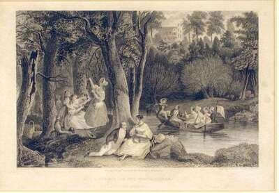 Hand-Colored Steel Engravings - Philadelphia Views, ca. 1850: "Penitentiary, Philadelphia." * "Fairmount Gardens, Philadelphia." * "Girard's-Bank in Philadelphia." * "A Pic-Nic on The Wissahickon." * "The Bridge over The Schuylkill." * "The Race Bridge. Fair Mount Water Works, Philadelphia." 6 x 8 1/2 inches (152 x 216 mm) or smaller. Several only partly colored.