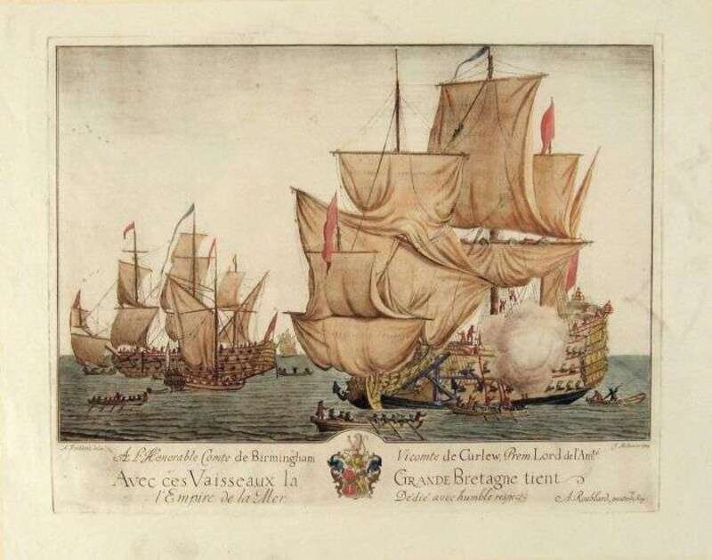 Hand-Colored Engravings - French Naval Battles. Milton, J., after Roublard, A.: "A l'Honorable Comte de Birmingham, Vicomte de Curlew, Prem. Lord de l'Amte avec ces Vaisseaux la Grande Bretange Tient..." 1709. 13 1/2 x 17 mm (343 x 430 mm), wide margins. Scattered light foxing, occasionally slightly dusty. 2 copies. * "A l'Honorable Burchet Esqr. Secretaire a l'Honorable Commission des Lords charge du grande... Bretagne..." 1706. 13 1/4 x 16 7/8 inches (336 x 428 mm), wide margins. Minor marginal foxing. 2 copies.* "Ce Vaisseau de sa Majeste, le Blenheim... Victories... Duc de Marlborough..." 1704. 13 1/2 x 17 inches (343 x 430 mm), wide margins. Scattered light foxing.
