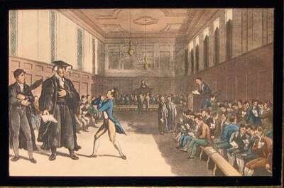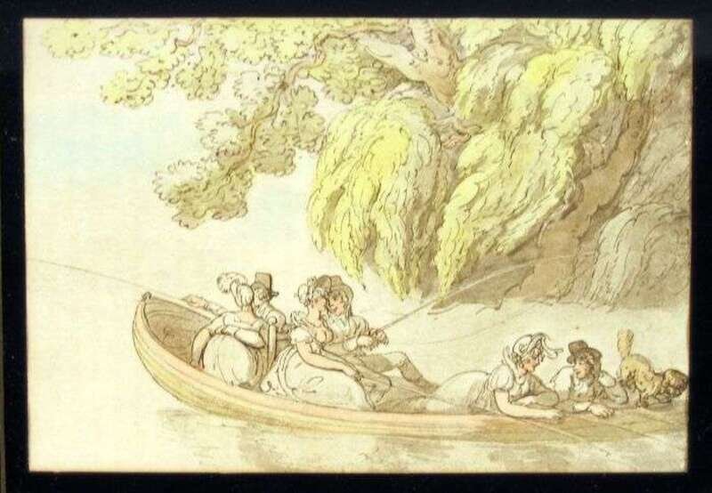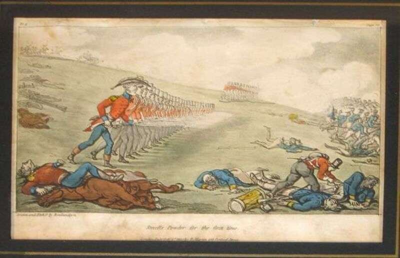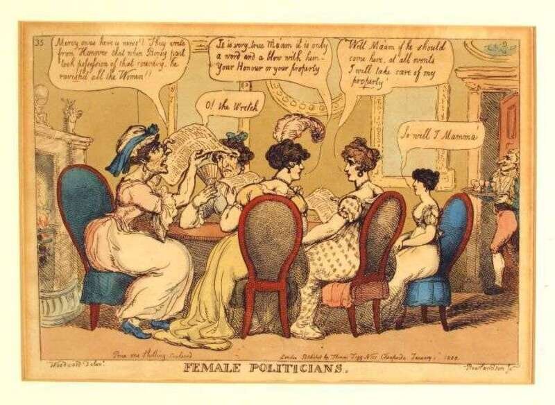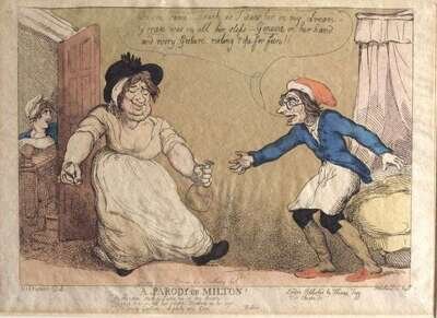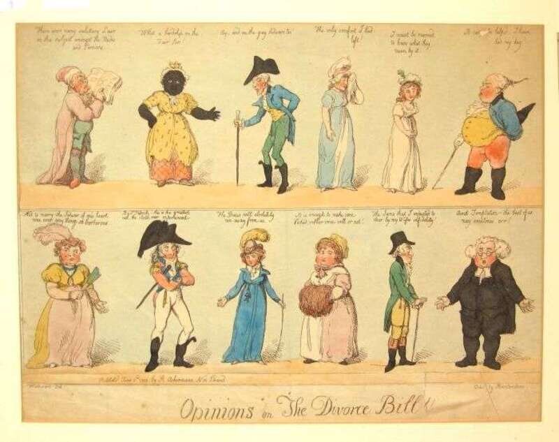 (Rowlandson, Thomas.) Hand-Colored Engravings. [English Caricature Prints]: Woodward, (George M.) "Opinions on The Divorce Bill." (London): Ackerman, June 2, 1800. Approx. 13 x 17 inches (330 x 432 mm). Slightly toned, a few small close tears & light creases. Etched by Rowlandson. * Woodward, (George M.). "A Parody of Milton." [London], [ca. 1800]. Approx. 10 x 13 inches (254 x 330 mm). Some mat burn, lightly toned. Rowlandson, sculpt. * Woodward, (George M.). "Female Politicians." London: Thomas Tegg, 1808. Approx. 9 3/4 x 13 inches (247 x 330 mm). Moderate mat burn, lightly toned. Rowlandson, sculpt. * Lot also includes 4 small format (approx. 5 x 7 inches) plates by & after Rowlandson (ca. 1800-1820). All framed. Not examined out of frames.