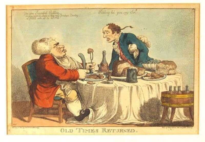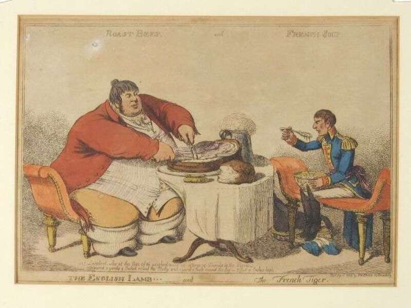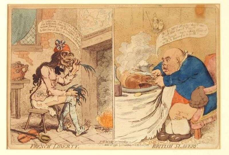Hand-Colored Engravings. [English Caricature Prints]: "French Liberty. British Slavery." London: H. Humphrey, Dec. 21, 1792. 9 7/8 x 13 3/4 inches (250 x 350 mm). Light to moderate toning, occasional edge wear. * "Old Time Returned." (London), S.W. Fores, May 18, 1802. Approx. 10 1/2 x 14 inches (266 x 355 mm). Light toning, occasional minor spotting, a few small close tears at margins. * "The English Lamb and The French Tiger." (London): S.W. Fores, April 1806. Approx. 9 3/4 x 13 3/4 inches (247 x 350 mm). All framed. Not examined out of frames.