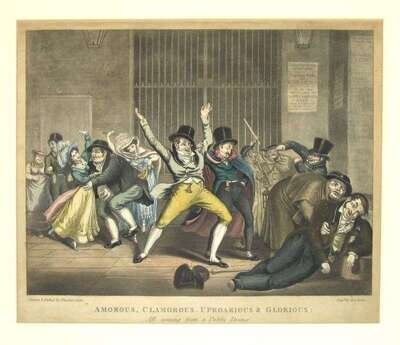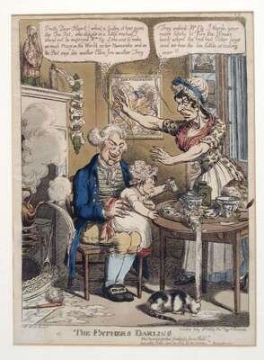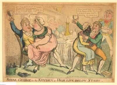 Hand-Colored Engravings. [English Caricature Prints & C]: W., C. "The Father's Darling." London: Tho. Tegg, [ca. 1810]. Approx. 13 1/4 x 9 1/2 inches (336 x 240 mm). Slightly toned. * "Royal George, in The Kitchen, or High Life Below Stairs." (London): J. Johnson, [ca. 1800]. Approx. 9 1/2 x 13 1/2 inches (240 x 343 mm). Light to moderate toning. * Hunt, G., after Lane, Theodore. "Amerous, Clamorous, Uproarious & Glorious, All coming from a Public Dinner..." [London], [ca. 1825]. Approx. 10 1/4 x 12 1/2 inches (260 x 318 mm). Light to moderate toning. All framed, all generally bright & well-colored. Not examined out of frames.