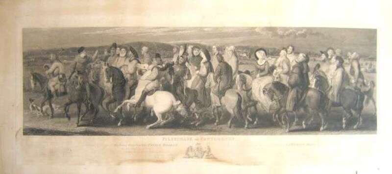 Etching. Schiavonetti, V.A. & Heath, James after Stothard, Thomas. "Pilgrimage to Canterbury." London: W.H. Worthington, Oct. 1, 1817. 14 x 38 1/2 inches (355 x 978 mm), mtd. on large blank sheet. Light to moderate dampstaining - mostly outside image. In later 19th-Century frame. Not examined out of frame.