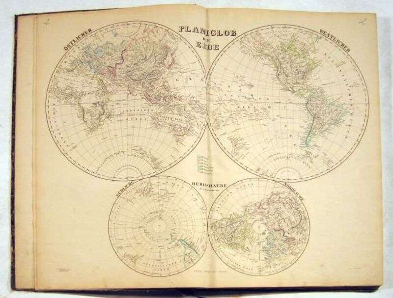 (World Atlas.) Kiepert, H., et al. Hand-Atlas der Erde und des Himmels. Vienna: Geographisches Institut, [ca. 1861-1862]. 42nd ed. Folio, contemp. cloth & bds.; worn. With 50 double-page engraved maps - most with outline hand color. Internally generally clean. Maps numbered in blue crayon on upper margins.