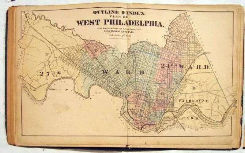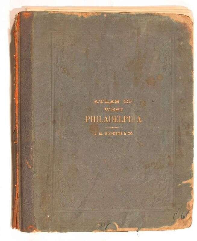 (Philadelphia Property Atlas.) Hopkins, G.M. Atlas of West Philadelphia, including the 24th & 27th Wards. Philadelphia, 1872. Folio, orig. gilt-lettered cloth, morocco back & corners; heavily rubbed. With color outline & index map + 15 color maps (13 double-page). Contents mostly loose, minor toning, occasional light chipping to edges.