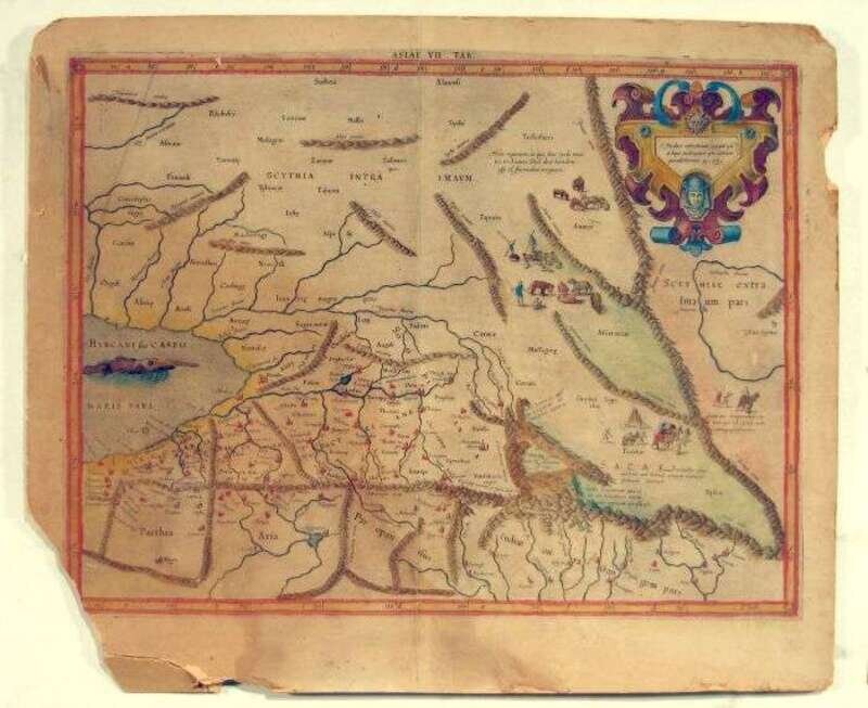 Hand-Colored Engraved Map. Mercator, Gerard. "Asiae VII." (Amsterdam), (1618). 13 5/8 x 18 1/4 inches (346 x 463 mm). Toned & mounted on bd. Chipping to edges of bds., bottom left corner chipped away with small portion of map. Ptolemaic map of Central Asia.