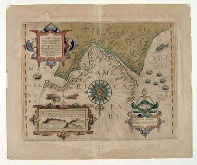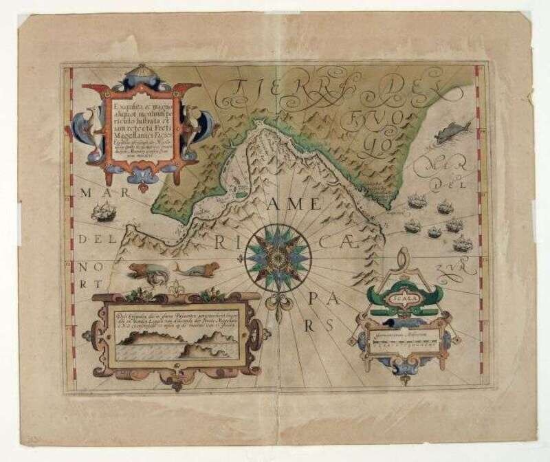 Hand-Colored Engraved Map. (Hondius, Henricus.) "Exquisita & Magno Aliquot Mensium Periculo Lustrata et Iam Retecta Freti Magellanici Facies..." (Amsterdam), (1609). 13 3/4 x 18 3/8 inches (336 x 466 mm), margins. Moderately but unevenly toned. Old (likely orig.) color. French text on verso.