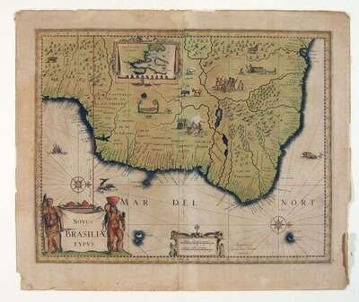 Hand-Colored Engraved Map. Bleau, Willem. "Novus Brasiliae Typus." Amsterdam, [1630]. 15 x 19 1/2 inches (380 x 495 mm), margins. Moderate toning, some chipping in margins. Crease along center vertical fold. Old (orig.?) color. Framed.