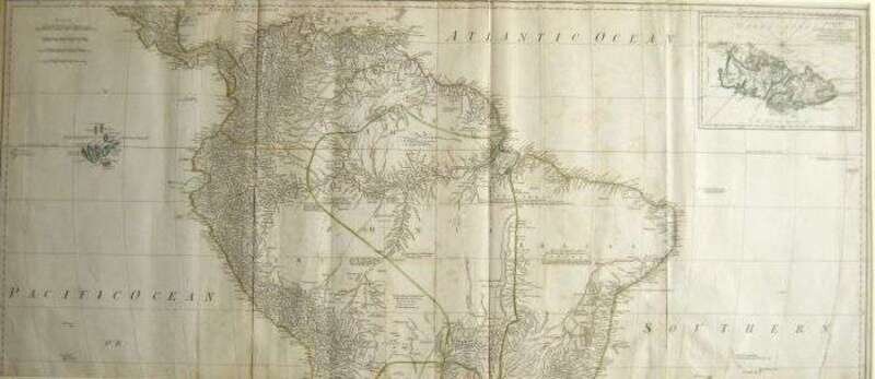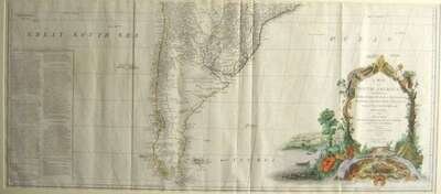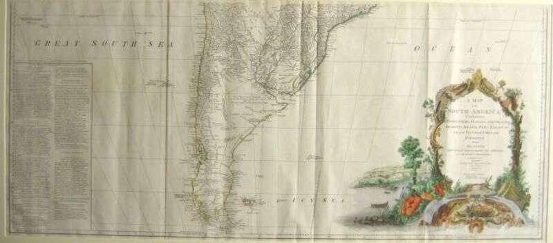 Engraved Map with Outline Color & Color Cartouche. Sayer, Robert. "A Map of South America Containing Tierra-Firma, Guayana, New Granada, Amazonia, Brasil, Peru, Paraguay, Chaco, Tucuman, Chili and Patagonia. From Mr. D'Anville with Several Improvements and Additions, and The Newest Discoveries." London, 1775. Two sheets, each 20 x 46 1/2 inches (508 x 1180 mm). Scattered light foxing on sheet representing the Northern part of South America, Birminham Library ink stamp on that portion, Southern portion sheet generally clean & crisp, occasional minor creasing. Original outline color, modern color added to cartouche. Each of the two sections framed separately.