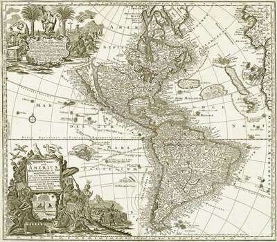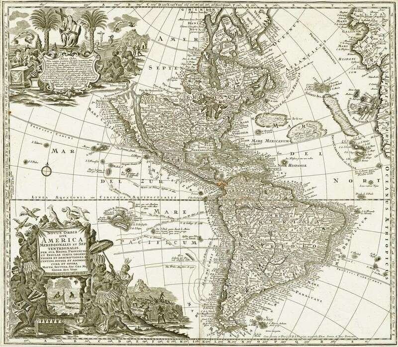 Partly Hand-Colored Engraved Map. Seutter, Georg Matthaus. Novus Orbis sive America Meridionalis et Septentrionalis... Augsburg, [ca. 1730]. 19 1/2 x 22 5/8 inches (495 x 575 mm). Trimmed just within plate mark. Generally clean & attractive. Color rather faded, cartouches & much of map uncolored. Showing California as an island. Framed.