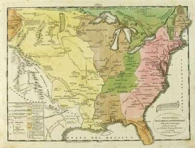 Hand-Colored Engraved Map. Tasso, G., publisher. "Stati-Uniti Dell'America Settentrionale." Venice, 1832. 13 x 18 inches (330 x 460 mm), margins. Generally crisp & clean, occasional spotting in margins. From an Italian edition of Le Sage's historical atlas. Showing Texas as a province of Mexico, Indian tribes, etc.