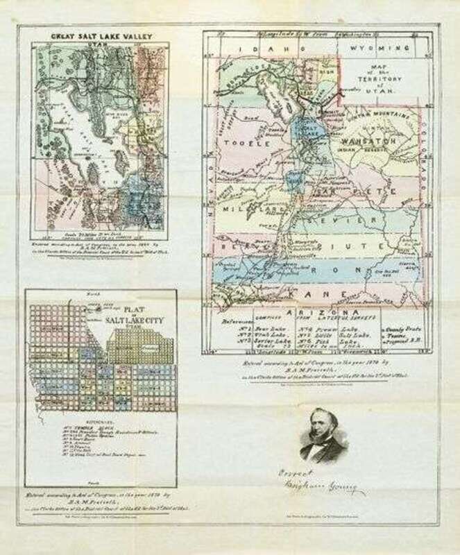 Colored Lithographic Fold Map. Froiseth, B.A.M. "Maps of Utah Territory, Great Salt Lake Valley and Salt Lake City" - casing title. New York: Am. Photo-lithographic Co., 1870. 16 3/4 x 13 3/4 inches (425 x 350 mm). In orig. gilt-lettered terra-cotta cloth casing - "Published by Skandinavish Post, N.Y." Occasional minor staining, but generally crisp & bright. 3 maps on 1 sheet, with portrait of Bringham Young.