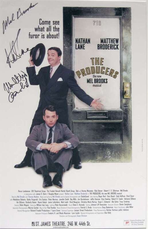 Color Theatre Poster Signed. "The Producers." New York, [ca. 2001]. Approx. 22 x 14 inches (560 x 355 mm). Signed by Mel Brooks, Nathan Lane & Matthew Broderick. Framed. Condition A.
