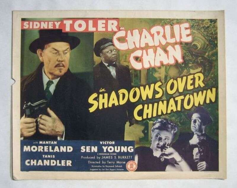 Movie Posters (Charlie Chan Series): "City in Darkness." 20th-Century Fox, 1939. Color litho half-sheet format, 22 x 28 inches (558 x 711 mm). A few repairs to verso, several close tears in margins, some dust soiling. Condition B-/B. Sidney Toler. With copyright date but no code markings. * "The Jade Mask." Monogram, 1944. Format as preceding; minor wear & dust soiling to edges. B+. Sidney Toler. * "Shadows over Chinatown." Monogram, [1946]. Format as preceding; light wear, minor dust soiling, small repair to verso, small chip on margin. B+. Sidney Toler. With no copyright date or code markings. * "Charlie Chan in The Secret Service." Monogram, 1943. Color litho insert format, 36 x 14 inches (915 x 355 mm). A few repairs to verso, occasional minor creasing & dust soiling. B/B+. Sidney Toler. * "Charlie Chan in Sky Dragon." Monogram, 1949. Format as preceding, a few repairs on verso. B+. * The Golden Eye." Monogram, 1948. Format as preceding, occasional minor creasing & dust soiling. B.