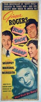 Movie Posters (Classic American Romantic Comedies, 1940s): "Tom, Dick and Harry." RKO, 1941. Color litho insert format, 26 x 14 inches (915 x 355 mm). Repairs to verso, several creases/fissures extending into image, chip to right margin, some dust soiling. Condition C/C+. * "Here Comes Mr. Jordan." Columbia, 1941. Format as preceding; light wear, minor creasing. B+. With copyright but without code markings. * "Christmas in Connecticut." Warner Bros., [1945]. Format as preceding; repair to margin verso, some creasing & dust soiling at edges. B. Without copyright or code markings. * "I Was A Male War Bride." 20th-Century Fox, 1949. Format as preceding; repairs to verso, a few creases/fissures in image. B. Cary Grant, directed by Howard Hawks. * "A Foreign Affair." Paramount, 1948. Format as preceding; repairs to verso, some dust soiling to edges, corners creased, a few stains on image. B-.
