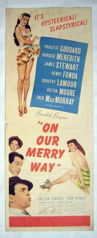 Movie Posters. (American Romantic & Domestic Comedies - 1948-1949): "Apartment for Peggy." 20th-Century Fox, 1948. * "On Our Merry Way." United Artists, 1948. James Stewart, Paulette Goddard, directed by King Vidor. * "Hazzard." Paramount, 1948. 2 copies. * "The Sainted Sisters." Paramount, 1948. Veronica Lake. * "The Voice of The Turtle." Warner Bros., 1948. * "John Loves Mary." Warner Bros., 1949. 2 copies. * "Once More My Darling." Universal, 1949. * "One Last Fling." Warner Bros., 1949. * "Tell It To The Judge." Columbia, 1949. 2 copies. * "Everybody Does It." 20th-Century Fox, 1949. * "It Happens Every Spring." 20th-Century Fox, 1949.