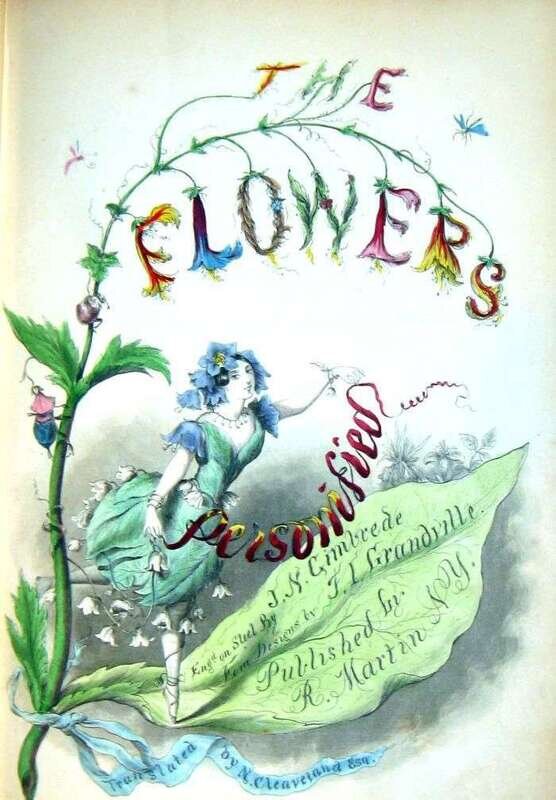 (Grandville, illustrator.) The Flowers Personified being a Translation of... "Les Fleurs Animees" by N. Cleaveland. New York: R. Martin, 1847-[1849]. Tall 8vo, modern bds., green morocco spine labels, a.e.g. With 2 additional hand-colored pictorial titles + 50 hand-colored plates. Light to moderate foxing to text, light to occasionally moderate foxing to plates (primarily edges). Without vol. 2 letterpress title. Tall copy. Bound with [in vol. 2]: Foelix, C. Modern Botany for Ladies... Translated by N. Cleaveland. New York: R. Martin, n.d. With 2 plates. Light to moderate foxing.