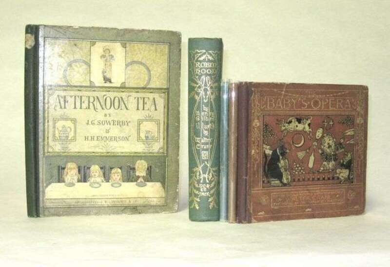 Walter Crane, et al., illustrators: Crane, Walter. The Baby's Opera. London: G. Routlege, [1877 or later]. 1st ed.? 4to, orig. pictorial brown bds.; moderately worn, occasional minor chipping. Color illus. by Walter Crane. * _ _. Baby's Own Aesop. London: Routlege, 1887. 1st ed. Sm. 4to, orig. color pictorial bds.; slightly scuffed, moderate edge wear. Color illus. & endpapers by W. Crane. Scattered light foxing. * (_ _.) The Baby's Bouquet. London: F. Warne, n.d. [ca. 1900]. Sm. 4to, orig. color pictorial bds.; moderate waer, edges occasionally chipped. Color illus. & endpapers by W. Crane. * (Crane, Walter, illustrator.) Gilbert, Henry. Robin Hood and The Men of The Greenwood. Edinburgh: T.C. & E.C. Black, 1912. 1st ed. Lg. 8vo, orig. gilt-lettered & decorated green cloth, t.e.g., other edges untrimmed. With 16 color plates (incl. frontis.). Minor foxing to front matter, one text leaf discolored by clippings. * (Sowerby, J.G.; Emmerson, H.H., illustrators.) Afternoon Tea: Rhymes for Children. Philadelphia: J.B. Lippincott, [1880]. 1st Am. ed. 4to, orig. color pictorial bds.; moderate wear, edges rather worn. Color illus. 1/2 title detached, its gutter discolored.