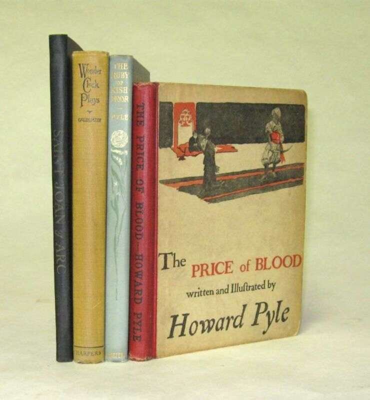 (Pyle, Howard, illustrator): Pyle, Howard. The Price of Blood. Boston: Richard G. Badger, 1899. 1st ed. Sm. 4to, orig. color pictorial bds., all edges stained red; light edge wear. With color frontis. + 5 plates. Internally clean. BAL 16398, bdg. state 2. * _ _. The Ruby of Kishmoor. New York: Harper, 1908. 1st ed. 8vo, orig. gilt-lettered, color & gilt-pictorial slate green cloth, t.e.g., other edges untrimmed. Color frontis. + 9 plates. Bright, tight copy. BAL 16412. * Goldsmith, Sophie, adapted by. Wonder Clock Plays. New York: Harper, 1925. 1st ed., thus. 4to, orig. black & red stamped yellow-green cloth; light wear. 12 plates, text illus. Minor wear. * Twain, Mark. Saint Joan of Arc. New York: Harper, (1919). 1st ed., 1st ptg. Sm. 4to, orig. black cloth; color pictorial cover label, t.e.g.; light wear. With 4 mounted color plates (incl. frontis.), green shoulder decorations. Attractive copy.