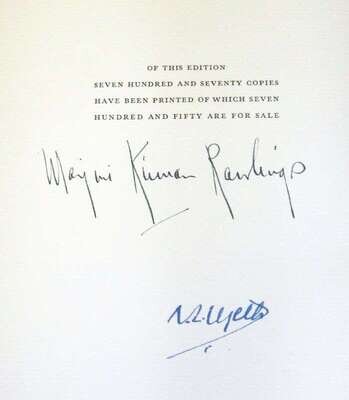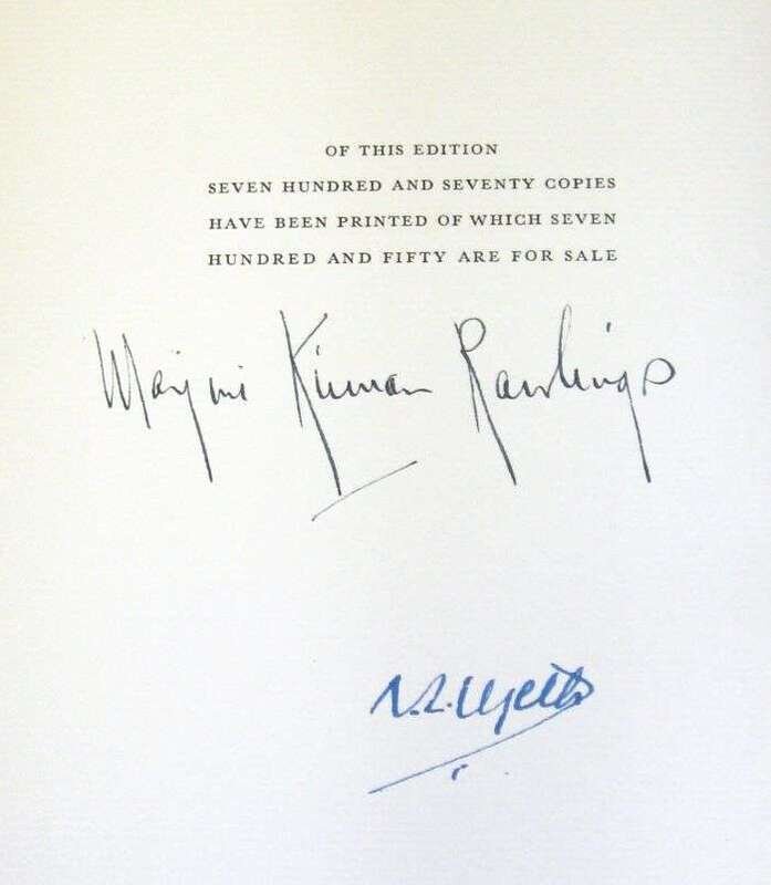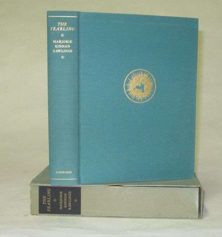(Wyeth, N.C., illustrator.) Rawlings, Marjorie Kinnan. The Yearling. New York: Scribner's, 1939. 1/770 signed by Wyeth & Rawlings. 4to, orig. gilt-pictorial blue-green cloth, gilt-lettered spine, t.e.g., other edges untrimmed; occasional light wear, slipcase & chemise with label (top panel of slipcase defective, other edge wear). With 14 color plates, 2 plain plates, facs. letter & color illus. endpapers by N.C. Wyeth.
