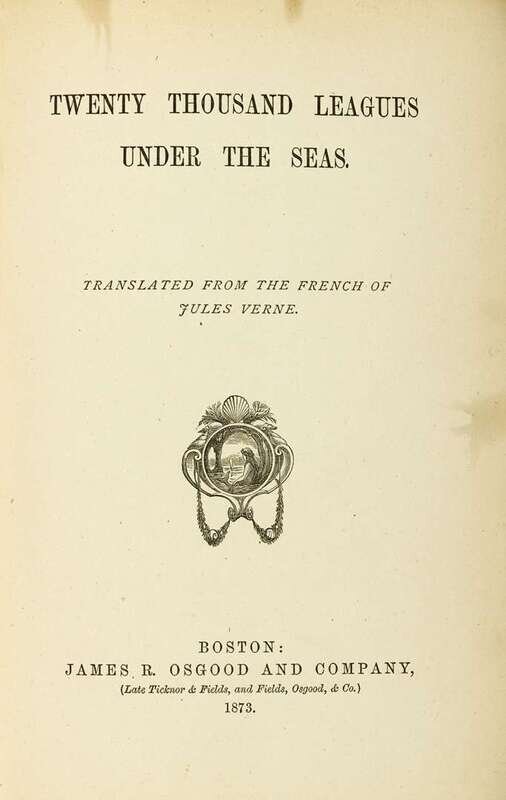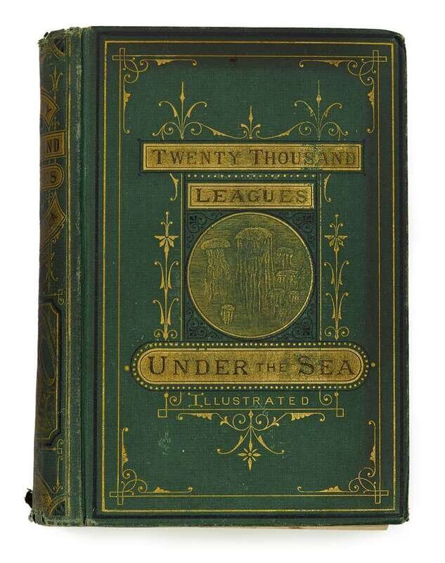 Verne, Jules. Twenty Thousand Leagues Under The Sea. Boston: James R. Osgood, 1873. First American edition. 8vo, orig. gilt-pictorial & decorated green cloth; spine separating from back joint, spine ends frayed, darkening to edges of back cover, other light edge wear. Frontis., map, plates. Bdg. just starting to break, a few leaves loose, a few edges chipped. Spine present & almost entirely intact.
