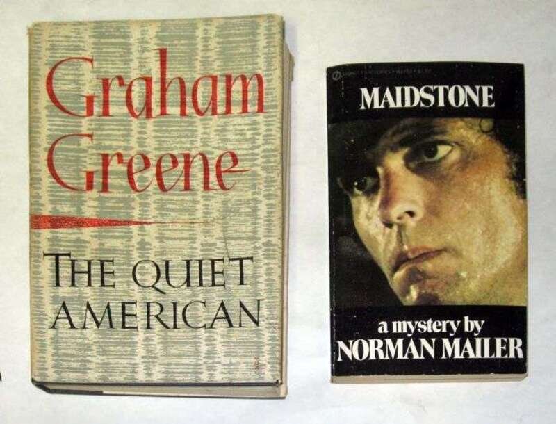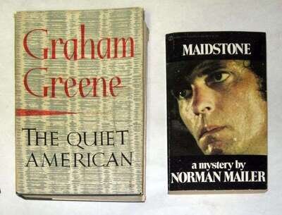 Modern First Editions: Greene, Graham. The Quiet American. London: W. Heinemann, (1955). 1st ed. 8vo, orig. blue cloth, gilt-lettered spine; minor spotting, slightly dusty, d/j (occasional edge wear, light to moderate dust soiling to back panel & front flap, cello-tape remains on flaps & paste-downs). Light foxing to front & back matter. Good. Wobbe A35a. * Mailer, Norman. Maidstone: A Mystery. (New York): Signet, (1971). 1st ed., 1st ptg. 12mo, orig. pictorial stiff wrappers; light wear. Color & plain plates.