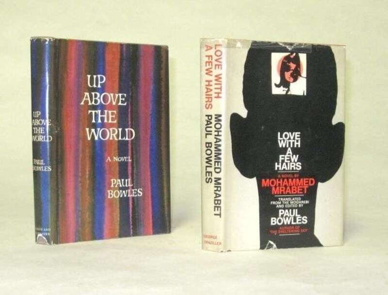 Paul Bowles: Bowles, Paul. Up Above The World. New York: Simon Schuster, (1966). 1st ptg. 8vo, orig. cloth, gilt; light edge wear, d/j (chip at foot of spine - just touching publisher's name, other minor wear to extremities). Inscribed, dated, "23/IX/95" & signed by Paul (Bowles) on front publisher's device page. Signature & book clean & attractive. * (Bowles, Paul, translator.) Mirabet, Mohammed. Love With A Few Hairs. Braziller, (1968). 1st Am. ed. 8vo, orig. cloth; light wear, d/j (cellotape repairs along upper edges). Inscribed & signed by Paul Bowles on 1/2 title.