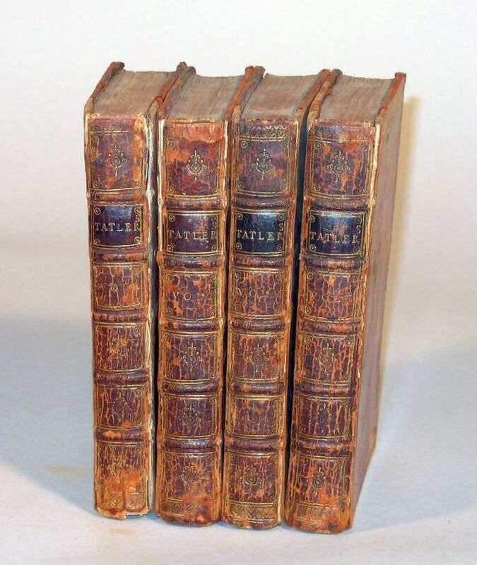 [Addison, Joseph; Steele, Richard, et al.] [The Tattler]: The Lucubrations of Isaac Bickerstaffe, Esq. London: for E. and R. Nutt, J. Knapton, [et al.], 1723. 12mo, old tan calf, gilt-ornamental spines, maroon morocco spine labels; rubbed, joints stressed, a few covers detached or detaching. Scattered foxing, occasionally heavy, most often moderate or light. Trimmed, a few heads shaved close. Revised & corrected ed.