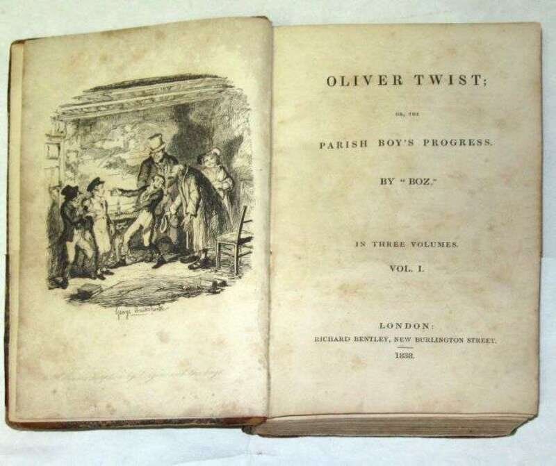 (Dickens, Charles.) Oliver Twist; or The Parish Boy's Progress. By "Boz." London: Richard Bentley, 1838. First edition, second issue. 8vo, contemp. 1/4 calf & marbled bds.; rubbed, spines defective. Front cover of vol. 1 detached. Lacking title page in vol. 2, lacking 1/2 titles called for in vols. 1 & 2, lacking adverts. at front of vol. 3. With 24 plates by George Cruikshank (1 loose). With 4 pp. adverts. at back of vol. 1. Scattered light to moderate foxing, plates often moderately foxed. Sold with all faults.