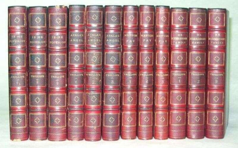 Trollope, Anthony: Is He Popenjoy? London: Chapman & Hall, 1878. 1st ed. 3 vols. 1/2 titles. Scattered light to occasionally moderate foxing. Sadlier 49. * Ayala's Angel. London: Chapman & Hall, 1881. 1st ed. 3 vols. Scattered, generally light, foxing. S. 60. * Marion Fay. London: Chapman & Hall, 1882. 1st ed. 3 vols. 1/2 titles. Internally clean. S. 66. * Mr. Scarborough's Family. London: Chapman & Hall, 1883. 1st ed. 3 vols. 1/2 titles. All 8vo, uniform contemp. 3/4 scarlet morocco & marbled bds., gilt, gilt spine compartments & lettering, t.e.g., other edges rough trimmed; spines darkened, heads & corners of Popenjoy rubbed & occasionally chipped, joints of Ayala's Angel rubbed, other scattered minor wear.